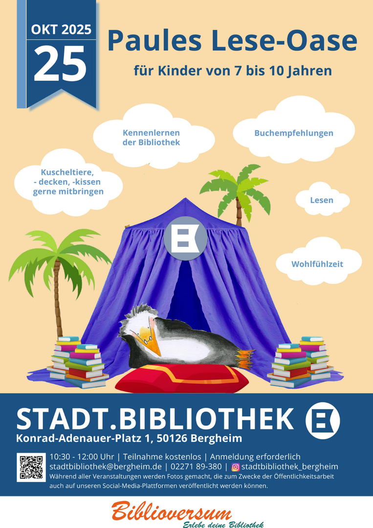 Am Samstag, den 25.10. findet von 10:30 bis 12 Uhr wieder Paules Leseoase statt. Diese Veranstaltung richtet sich an alle Leseratten-Kinder ab 7 Jahren, die schon gerne selbst lesen und das in angenehm ruhiger Wohlfühl-Atmosphäre. Genauere Informationen zur Veranstaltung gibt es hier: