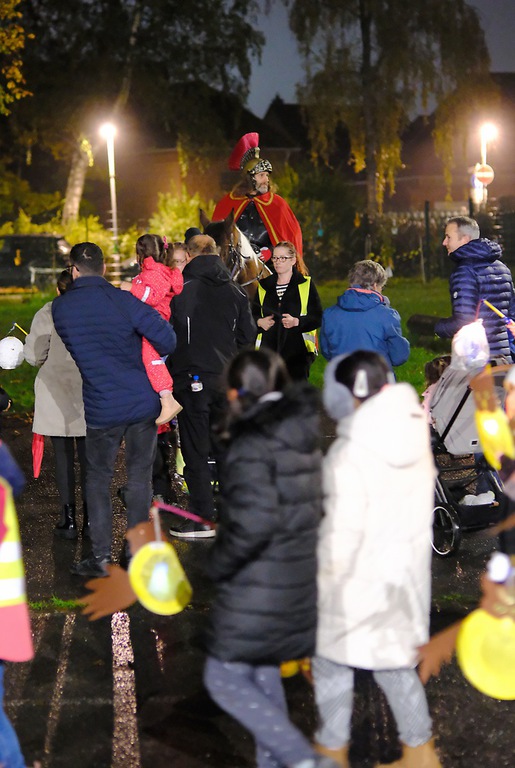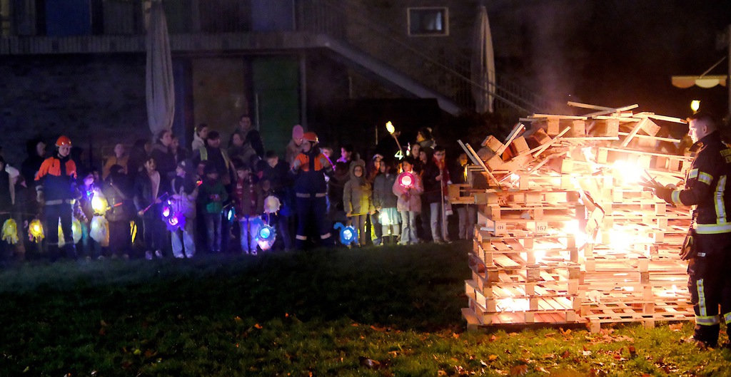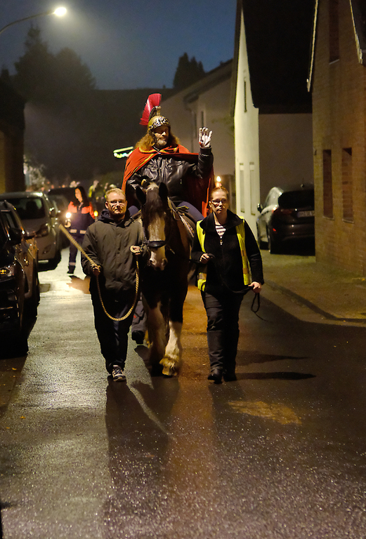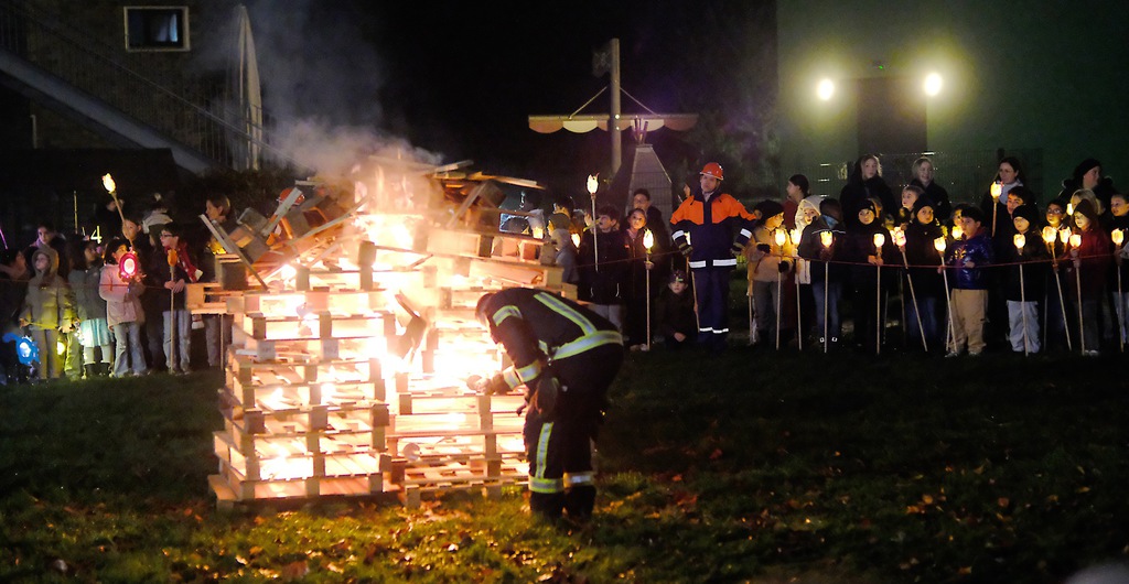 Abends trugen dann alle Schul- und Kindergartenkinder, angeführt von Sankt Martin auf seinem Pferd, stolz ihre selbstgebastelten Laternen durch die Straßen und erfreuten mit ihrem Gesang und Lichtermeer die Bewohner von Niederaußem. Zum Abschluss versammelten sich alle Kinder und Erwachsenen zum traditionellen Martinsfeuer auf dem Schulhof. Es war für alle Beteiligten wieder ein stimmungsvolles Erlebnis.