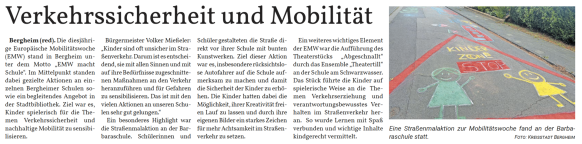Außerdem fand im Rahmen der diesjährigen Europäischen Mobilitätswoche (EMW) in Zusammenarbeit mit der Stadt Bergheim eine große Straßenmalaktion vor unserer Schule statt. Die Kinder der 3. und 4. Klassen durften die Straße mit großen Bildern schmücken, um damit rücksichtslose Autofahrer auf die Schule aufmerksam zu machen und so für mehr Sicherheit auf dem Schulweg zu sorgen.